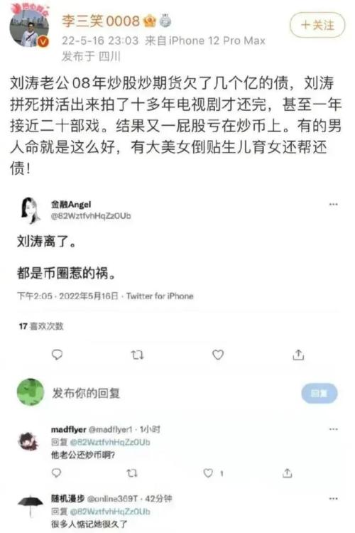 微博博主“李三笑0008”引用了相关消息称“刘涛老公08年炒股炒期货欠了几个亿的债,刘涛拼死拼活出来拍了十多年电视剧才还完,甚至一年接近二十部戏。结果又一屁股亏在炒币上。有的男人命就是这么好,有大美女倒贴生儿育女还帮还债!”