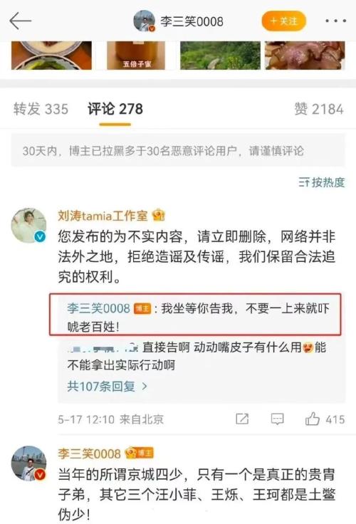 随后“李三笑0008”又在评论区放出AOE大招,内涵京城四少,称“当年所谓的京城四少,只有一个是真正的贵胄子弟,其他三个汪小菲、王烁、王珂都是土鳖伪少!”
