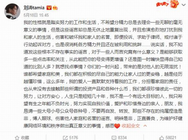 18日下午,刘涛在长文中表示自己本不想回应,但传言已经影响到他们家庭,指责造谣者为了流量没有底线,告诫营销号不要再捏造是非和博眼球,维护好健康网络环境。