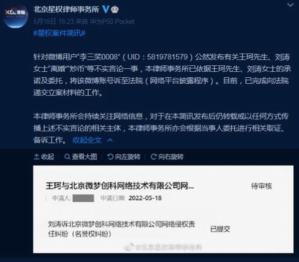 刘涛在回应的同时,委托律师事务所该微博账号诉至法院(网络平台披露程序)。目前,已完成向法院递交立案材料的工作。