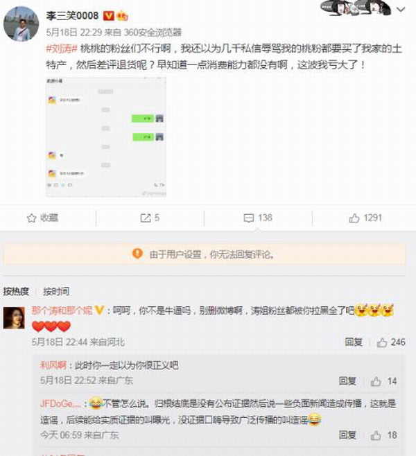 但是“李三笑0008”并不在意,甚至还反讽称“桃桃的粉丝们不行啊,我还以为几千私信辱骂我的桃粉都要买了我家的土特产,然后差评退货呢?早知道一点消费能力都没有啊,这波我亏大了!”