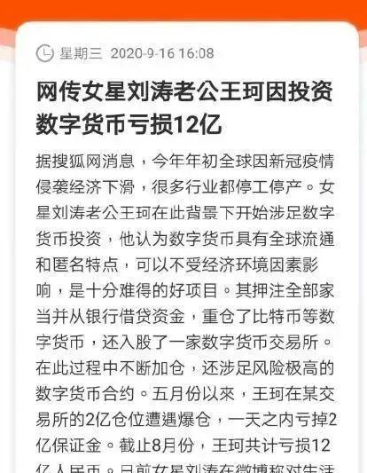 刘涛夫妻二人的离婚传闻,上一次要追溯到2020年9月,当时有媒体报道称,王珂因投资比特币亏掉12亿。