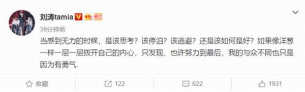 巧合的是,刘涛在传言出来的同一时间段,发了一条微博感叹:“无力的时候是该思考?该停泊?该逃避?还是该如何是好?”
