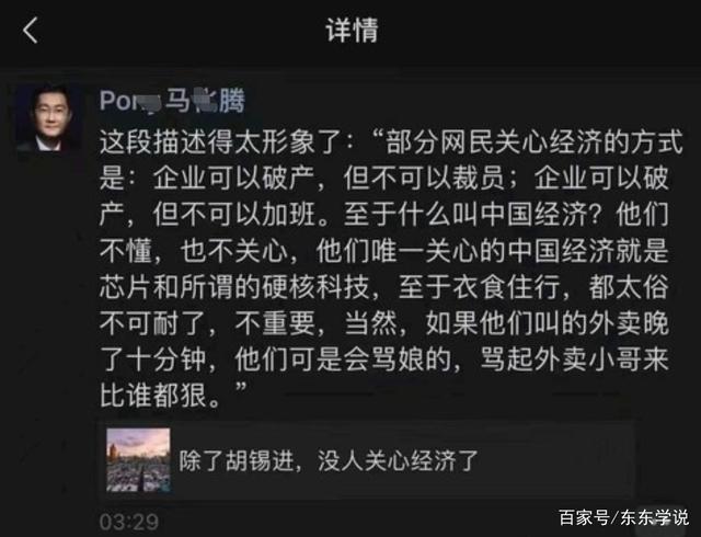 由于鹅厂的多轮裁员,引发社会的广泛关注,正面与负面的评价都有;当然负面的新闻比较多;给鹅厂造成了一定的压力;小马哥亲自跳出来为公司辩白了一番。说的话有一定的道理,但是这样硬怼其实是有失风度的,还顺带把胡锡进也捎上了。老胡只是对当前的经济环境说了一番自己的理解,又没有为鹅厂背书。