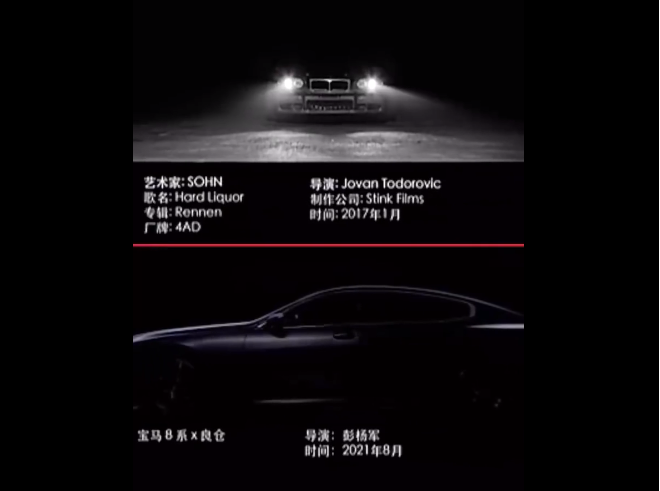 彭杨军拍摄的广告片名为《良仓x全新BMW 8系》,发布于2021年8月。而涉嫌抄袭歌手SOHN于2017年1月13日发行专辑《Rennen》中的一首歌,名为“Hard Liquor”,时长4分04秒。拍摄导演为 Jovan Todorović。