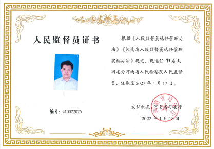近日,河南省司法厅下发了《关于任命丁刚等96名同志为河南省人民检察院人民监督员的决定》豫司文【2022】53号文件,河南省晋商会(中国晋商俱乐部联合发起机构)会长、河南华水建筑工程有限公司董事长郭启文名列其中。