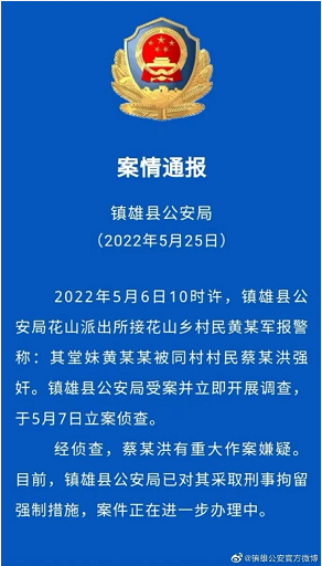 5月25日,据云南省镇雄县公安局通报:2022年5月6日10时许,镇雄县公安局花山派出所接花山乡村民黄某军报警称:其堂妹黄某某被同村村民蔡某洪强奸。镇雄县公安局受案并立即开展调查,于5月7日立案侦查。