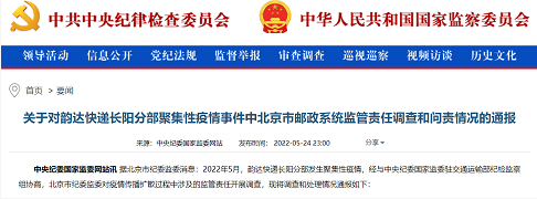 2022年5月,韵达快递长阳分部发生聚集性疫情,经与中央纪委国家监委驻交通运输部纪检监察组协商,北京市纪委监委对疫情传播扩散过程中涉及的监管责任开展调查,现将调查和处理情况通报如下: