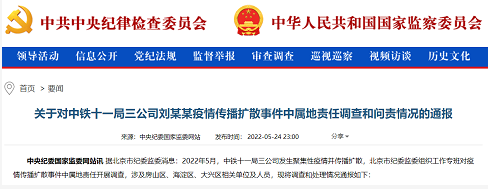 2022年5月,中铁十一局三公司发生聚集性疫情并传播扩散,北京市纪委监委组织工作专班对疫情传播扩散事件中属地责任开展调查,涉及房山区、海淀区、大兴区相关单位及人员,现将调查和处理情况通报如下: