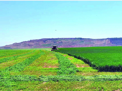 眼下正是苜蓿草收割的季节,在山西鑫奥特矿山治理现代农业示范园的牧草种植基地,进口的收割机、打捆机、拉运车穿梭在连片的绿草中,成为一道亮丽的风景。