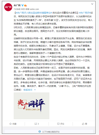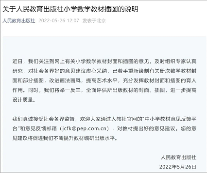 5月26日,人民教育出版社微博回应称,已着手重新绘制有关册次数学教材封面和部分插图,改进画法画风,提高艺术水平,充分发挥教材封面和插图的育人作用。