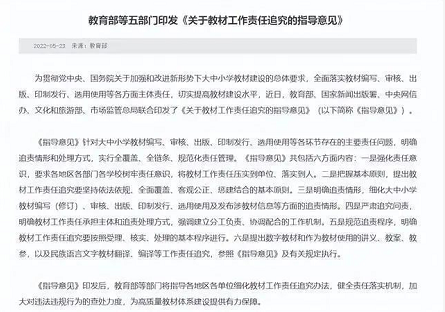 值得一提的是,5月23日,教育部官网印发了《关于教材工作责任追究的指导意见》,其中明确指出:要全面落实教材编写、审核、出版、印制发行、选用使用等各方面主体责任,同时要加大对违法违规行为的查处力度,为高质量教材体系建设提供有力保障。