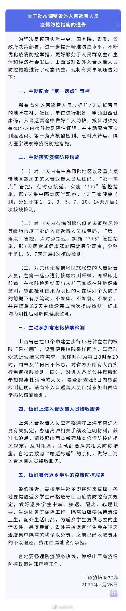 为坚决贯彻落实党中央、国务院,省委、省政府决策部署,进一步提升精准防控水平,不断优化疫情防控举措,更好服务于人民群众生产生活和经济社会发展,山西省对省外入晋返晋人员防控措施进行了动态调整,现将有关事项通告如下: