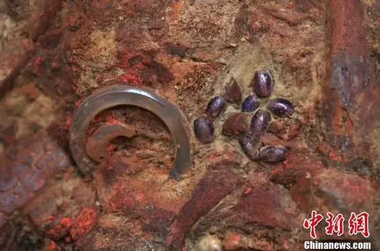 西省考古研究院7日对外发布考古新发现,当地考古人员在山西省襄汾县陶寺北墓地发现一座春秋晚期的女性贵族墓葬,墓主人身怀有孕,考古人员判断该墓主人身份为当时的大夫夫人。陶寺村位于山西省临汾市襄汾县,墓地位于陶寺村北,因盗墓发现。本次发掘的墓葬墓口长6.5米、宽5.4米、深9.8米,木质葬具已腐朽。墓主人为一女性,30岁出头,腹部可见胎儿头骨,胎龄8个月。墓中出土各类器物134件(组),其中铜器居多,其余为铅锡器、玉石器、骨器、陶泥器等。图为棺内出土玛瑙饰件。