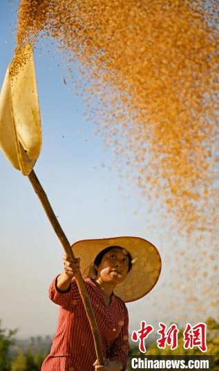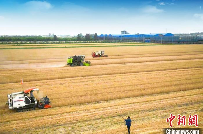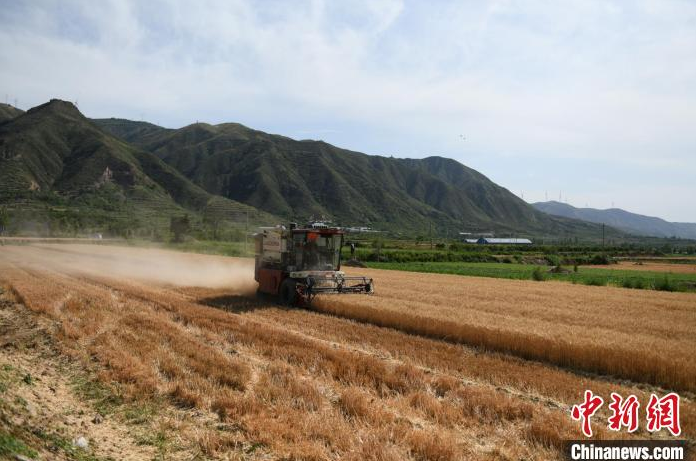 中新网太原6月7日电 (任丽娜)时下,山西省临汾市曲沃县近26万亩的冬小麦已经黄熟了,麦田里一片金光灿灿,沉甸甸的麦穗在微风中摩娑作响,一波又一波麦浪在起舞,田野飘香。乡间车水马龙,机声隆隆,大地如彩绘,麦田似画卷,田间农人收麦忙。