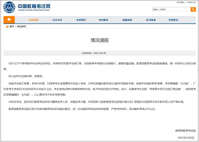 6月8日,中国教育考试网发布情况通报称,6月7日下午高考数学科目考试结束后,有网民发布数学全国乙卷、全国新高考I卷部分试卷图片,被疑泄露试题。教育部教育考试院高度重视,第一时间向公安机关报案。