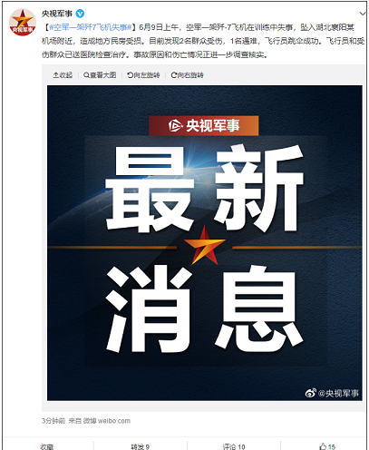 @央视军事 消息,6月9日上午,空军一架歼-7飞机在训练中失事,坠入湖北襄阳某机场附近,造成地方民房受损。目前发现2名群众受伤,1名遇难,飞行员跳伞成功。飞行员和受伤群众已送医院检查治疗。事故原因和伤亡情况正进一步调查核实。