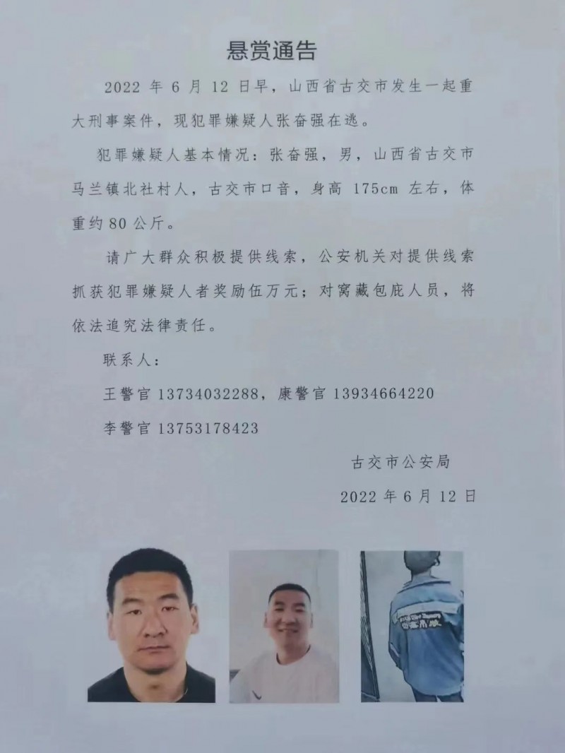 2022年6月12日早,山西省古交市发生一起重大刑事案件,现犯罪嫌疑人张奋强在逃。