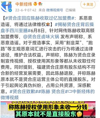 6月8日,“贤合庄加盟商维权”的消息冲上热搜。舆论发酵后,“陈赫收取过亿加盟费”的话题,也让此前与贤合庄“深度捆绑”的明星陈赫,又一次成为焦点。