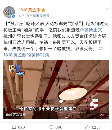 去年4月,一对夫妻在贤合庄火锅店用餐时,天花板突然掉落。女子被天花板砸到了头部和手部,男子则被天花板砸翻的火锅锅底烫伤。