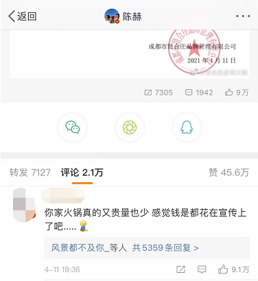 “你家火锅真的又贵量也少,感觉钱都是花在宣传上了吧”,单条评论点赞量9.1万。除此之外,还有在火锅里吃出塑料、被质疑使用合成肉等不少差评。