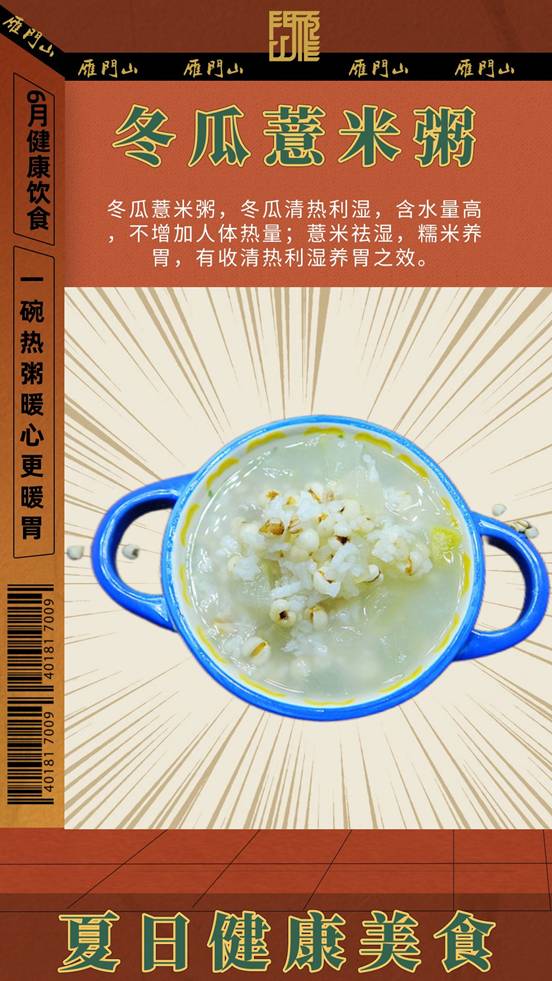 冬瓜薏米粥,冬瓜清热利湿,含水量高,不增加人体热量;薏米祛湿,糯米养胃,有收清热利湿养胃之效。