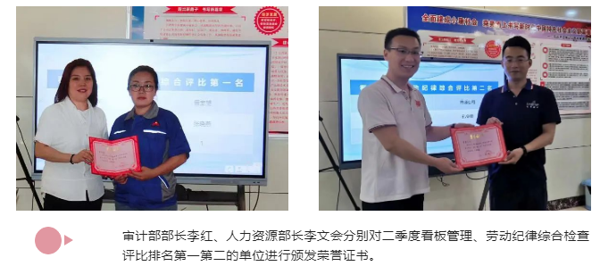 审计部部长李红、人力资源部长李文会分别对二季度看板管理、劳动纪律综合检查评比排名第一第二的单位进行颁发荣誉证书。