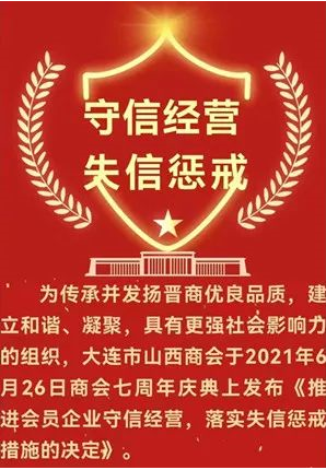 大连会山西商会于2021年6月26日商会七周年庆典上发布《推进会员企业守信经营,落实失信惩戒措施》的决定,目的是为传承并发扬晋商优秀品质,建立和谐、凝聚,以及更具影响力的社会组织。