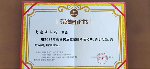 山西省商务厅、山西省工商联、山西省贸促会、山西省小企业发展促进局、山西省投资促进局、山西省人民政府驻上海办事处联合山西省民政厅,在世界晋商上海论坛组织工作委员会上向大连市山西商会颁发在“2021年山西灾后重建捐助活动中,勇于担当,贡献突出”的荣誉证书。