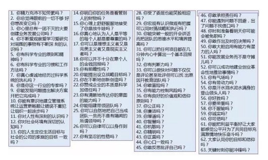比如说,有一条“你能自嘲吗?”如果不能以自嘲的方式承认错误、承担责任,你就不能带团队。你必须和你的同事说:“兄弟,这事你做得不错,是那天我做错了,你干得比我说得好。”这样大家才能有一个可以继续工作的氛围。只有具备这些素质后,才可以尝试去做企业经理,否则不可能在长久、持续的竞争中让团队保持激情。