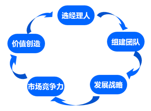 这个循环过程中的每一步都要走好,因为是乘数效应。经理人做对了得1分,如果做的不好0.5分,后面所有的就都错了一半。如果到了团队再错0.5分,到发展战略就成了零点零几分了。所以企业循环过程中做到均好,才能把战略和组织协同起来。