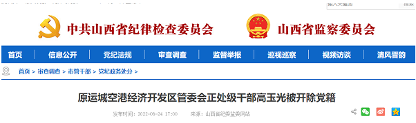 日前,经运城市委批准,运城市纪委监委对原运城空港经济开发区管委会正处级干部高玉光严重违纪违法问题进行了立案审查调查。