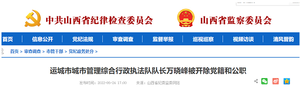 日前,经运城市委批准,运城市纪委监委对运城市城市管理综合行政执法队队长万晓峰严重违纪违法问题进行了立案审查调查。
