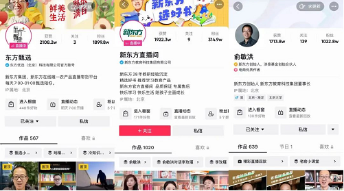 新东方直播团队在抖音上构建了“新东方直播间”、“东方甄选”、“俞敏洪”三大账号,其中,东方甄选成立于2021年12月28日,发展初期定位于新东方旗下的农产品直播带货平台,目前还有“东方甄选之图书”账号,有消息说,东方甄选未来会渗透更多门类。