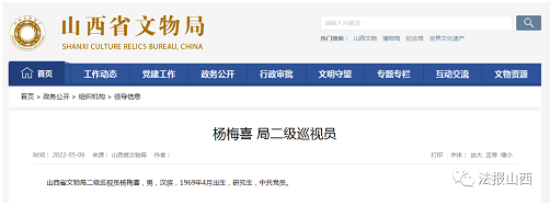 据山西省文物局官网显示,原忻州市公安局局长杨梅喜,目前已经转岗至山西省文物局,为山西省文物局二级巡视员。