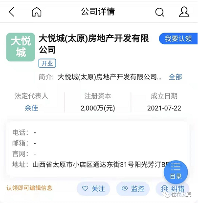 根据爱企查公开的大悦城(太原)房地产开发有限公司资料显示,该公司注册资本2000万元人民币,大悦城控股集团西北有限公司持股100%,注册地址为太原市小店区通达东街31号。
