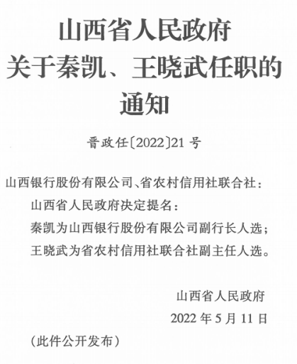 秦凯为山西银行股份有限公司副行长人选;