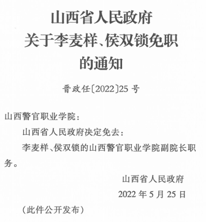 李麦样、侯双锁的山西警官职业学院副院长职务;