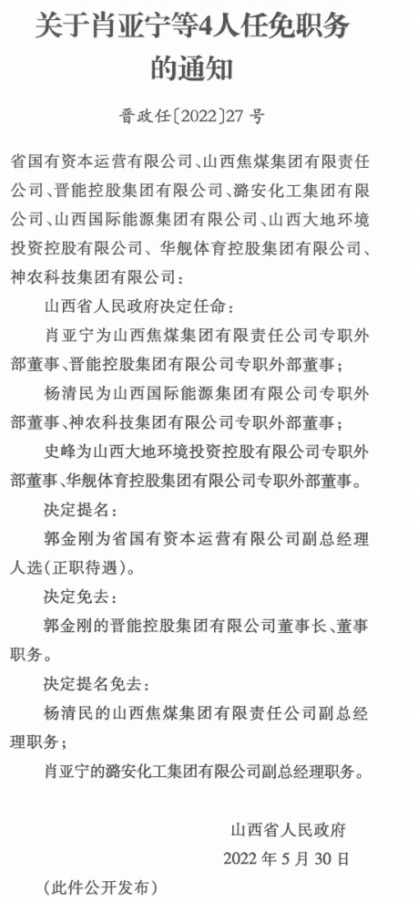 肖亚宁为山西焦煤集团有限责任公司专职外部董事、晋能控股集团有限公司专职外部董事。世界晋商网关注到,肖亚宁此前任职山西潞安矿业(集团)有限责任公司副总经理,此次已提名免去。