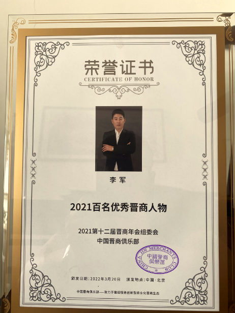 2022年6月29日,受2021第十二届晋商年会组委会、中国晋商俱乐部秘书处委托,河南省晋商会向2021百名优秀晋商人物、河南晋鑫晟贸易有限公司董事长李军颁发了荣誉奖牌。