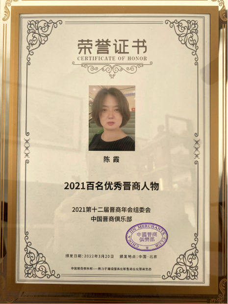 2022年7月1日,受2021第十二届晋商年会组委会、中国晋商俱乐部秘书处委托,葫芦岛市山西商会向2021百名优秀晋商人物、兴城市晋达服装有限公司总经理陈霞颁发了荣誉奖牌。