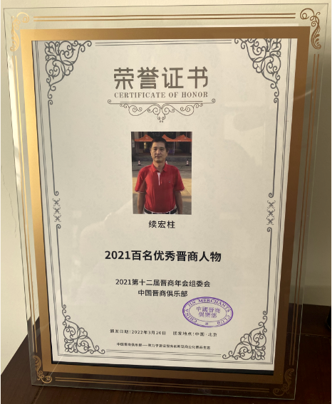 2022年6月20日,受2021第十二届晋商年会组委会、中国晋商俱乐部秘书处委托,深圳市山西商会向2021百名优秀晋商人物、太原市金湾横琴房地产经纪有限公司总经理续宏柱颁发了荣誉奖牌。