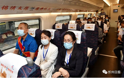 走进车厢,让记者眼前一亮。宽敞的空间、蓝色条纹的座套,显得舒适而温馨。乘客们纷纷掏出手机,或拍照录像,或向家人朋友视频分享着这一激动人心的时刻。行驶途中,工作人员不仅用接地气的忻州话向旅客推介忻州美食,还声情并茂地演绎了晋剧《算粮》片段,歌曲《唱支山歌给党听》更是把气氛推向了高潮.......一个个精彩的节目,引来旅客们阵阵掌声。