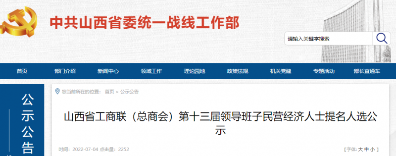 根据中央和省委有关文件精神,经中共山西省委研究,现将省工商联(总商会)第十三届领导班子民营经济人士提名人选公示如下: