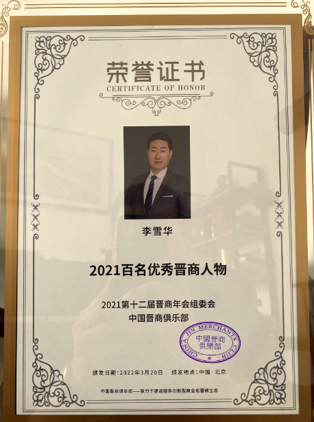 2022年7月4日,受2021第十二届晋商年会组委会、中国晋商俱乐部秘书处委托,重庆市山西商会向2021百名优秀晋商人物、重庆网爵科技有限公司总经理李雪华颁发了荣誉奖牌。