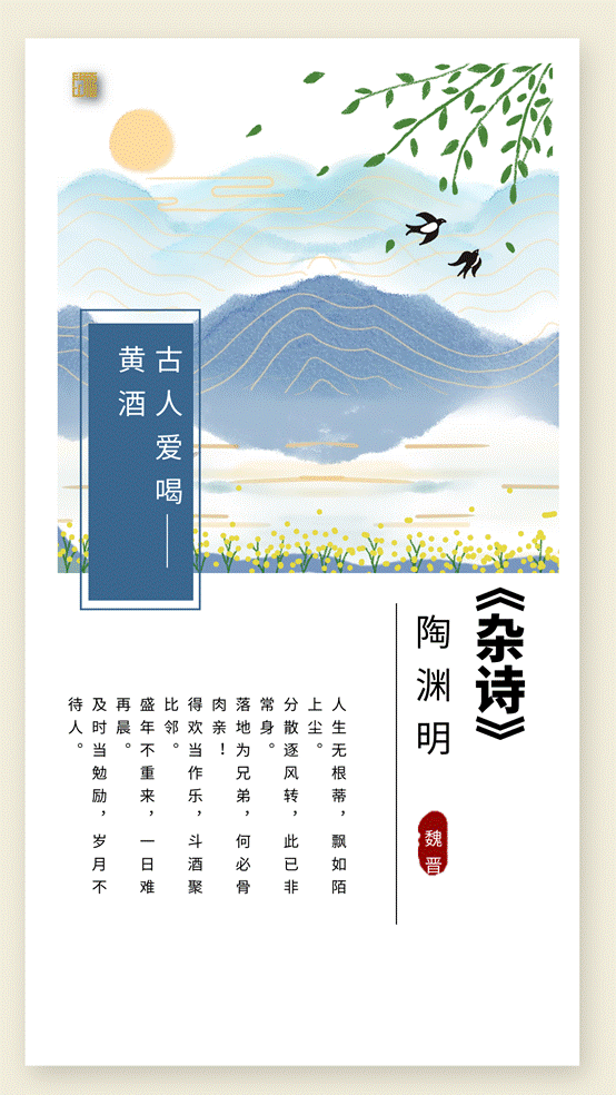 魏晋陶渊明的《杂诗》:”落地为兄弟,何必骨肉亲!得欢当作乐,斗酒聚比邻。“这里的斗就是古代计量容器,用来称酒的,一斗大概能装十几斤酒,换做白酒肯定喝伤了身体,所以这里的酒是黄酒。曹操的《短歌行》:“何以解忧、唯有杜康”。其实这里的杜康指的便是黄酒;四大名著之一《三国演义》中关羽温酒斩华雄喝的也是黄酒;李白斗酒诗百篇,长安市上酒家眠。斗是古代的计量容器,李白爱酒,酒后佳句频出,只有酒精度数14-20度的黄酒才能成就李白的千杯不醉;宋代诗人陆游《对酒戏作》:“乱插酴醾压帽偏,鹅黄酒色映觵船。醺然一枕虚堂睡,顿觉情怀似少年。这里的鹅黄酒色就是黄酒的颜色。曹操、李白、陆游所饮的都是黄酒,在历史大多文人墨客饮用的都是黄酒,因为在那个年代只有黄酒才能被称之为酒。
