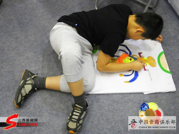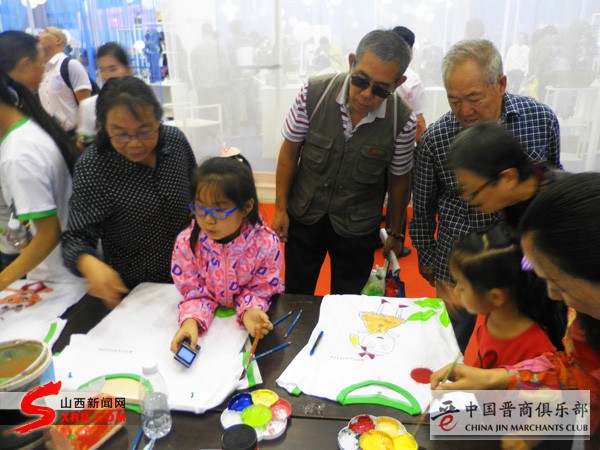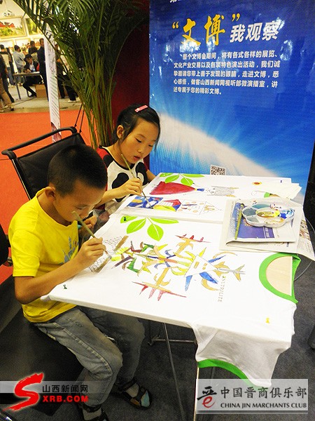 在山西日报报业集团展馆三晋都市报展位前,一场“美丽山西·文博会少儿主题涂鸦大赛”正在上演,展位被围得水泄不通,家长和孩子们纷纷领上涂鸦用的白色T恤衫,调开绘画颜料,在T恤上涂鸦。