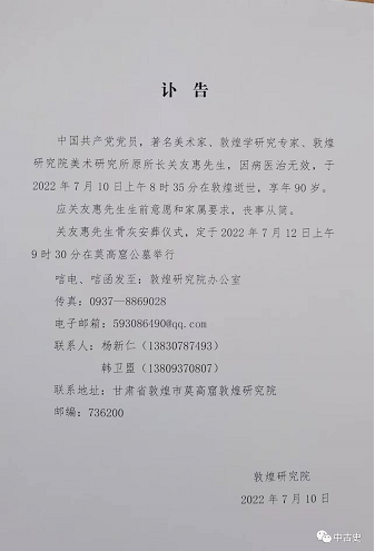2022年7月10日上午8时35分,中国共产党党员,著名美术家、敦煌学研究专家、敦煌研究院美术研究所原所长关友惠,因病医治无效,在敦煌逝世,享年90岁。