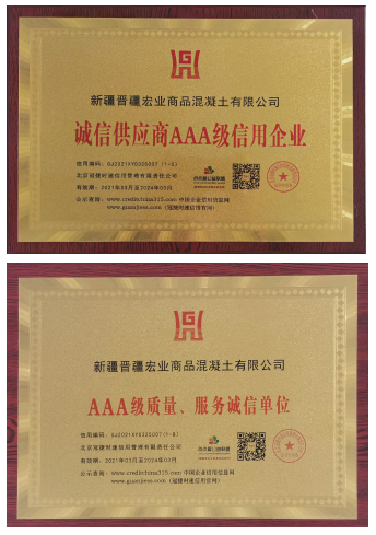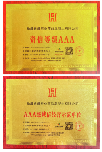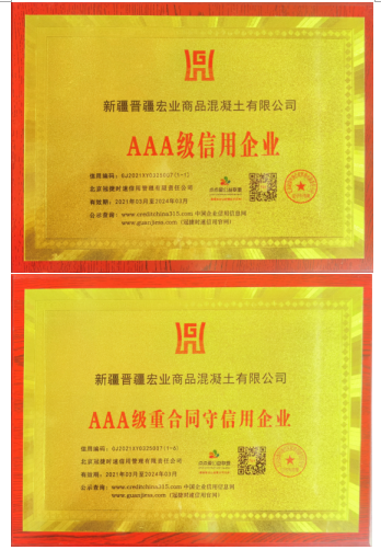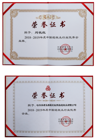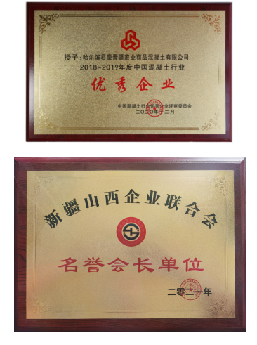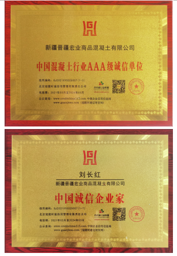 2019年11月,哈尔滨君豪晋疆宏业商品混凝土有限公司喜获“黑龙江省AAA级诚信企业”、“黑龙江省行业知名企业”、“黑龙江省产品质量过硬信誉保证放心企业”、“黑龙江省商品混凝土行业资信等级证书黑龙江省一级”等级证书。在2020年中国混凝土行业优秀企业评选活动中,哈尔滨君豪晋疆宏业商品混凝土有限公司荣获“2018-2019年度中国混凝土行业优秀企业”,刘长红评选为“中国混凝土行业优秀企业家”。在2020年昌吉回族自治州混凝土公司优秀企业评选活动中,新疆公司荣获获得中国基础工程综合信息中心颁发“凝聚品质,共铸辉煌”优秀企业一等奖。2021年,由中国人民银行备案和监管,新疆晋疆宏业商品混凝土有限公司获得由“中国企业信用信息网”和“冠捷时速信用官网”认可的“AAA级诚信经营示范单位证书”、“混凝土行业AAA级诚信单位等级证书”、“AAA级诚信供应商等级证书”、“AAA级质量、服务诚信单位证书”、“AAA级重合同守信用企业证书”、“AAA级资信等级证书”、“AAA级企业信用等级证书”;刘长红荣获“诚信企业家证书”。