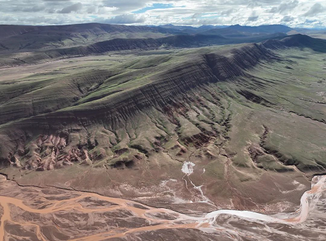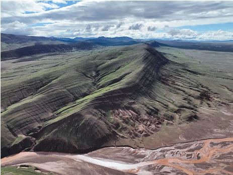 此处“红山脉”位于可可西里盆地中部。记者跟随科考队在现场看到,红褐色山体在可可西里夏季的绿色草原中十分显眼,山体上地层清晰,呈现出层叠状态。